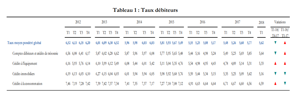 Le taux débiteur global appliqué par les banques à leur clientèle non financière s'est élevé à 5,62% au premier trimestre de l'année 2018, selon Bank Al-Maghrib.